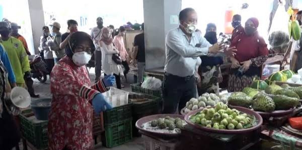 Risma memimpin sosialisasi PSBB di tempat keramaian seperti di Pasar Genteng.