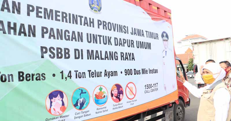 Pemerintah Provinsi Jawa Timur mengirimkan bantuan bahan pangan untuk dapur umum dalam rangka persiapan penerapan Pembatasan Sosial Berskala Besar (PSBB) Malang Raya. Masing-masing untuk Kabupaten Malang, Kota Malang dan Kota Batu dibantu Pemprov Jatim sebanyak 11 ton beras, 1,4 ton telur ayam, dan juga 900 dus mie ayam.