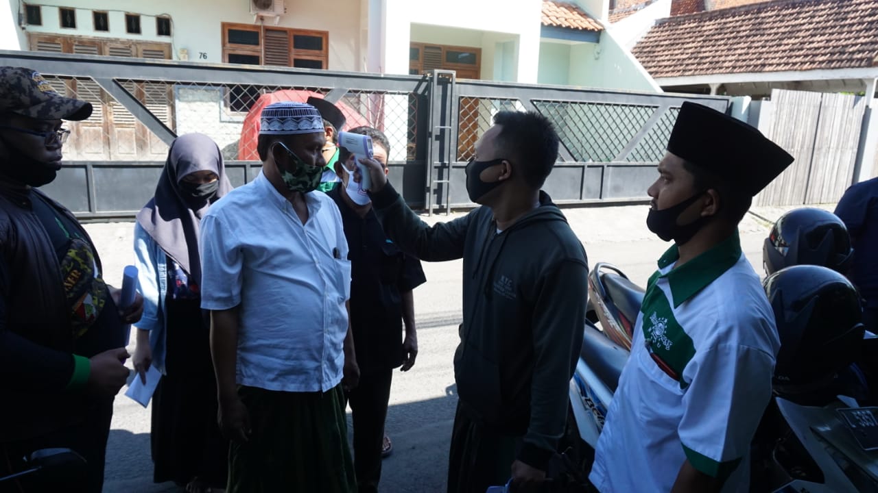 Penerima bantuan antri berjarak lebih satu meter. Kemudian sebelum memasuki gedung MWCNU Gubeng, di jalan Juwingan Surabaya, panitia mengecek suhu tubuh dengan thermogun dan warga harus mencuci tangan terlebih dulu.