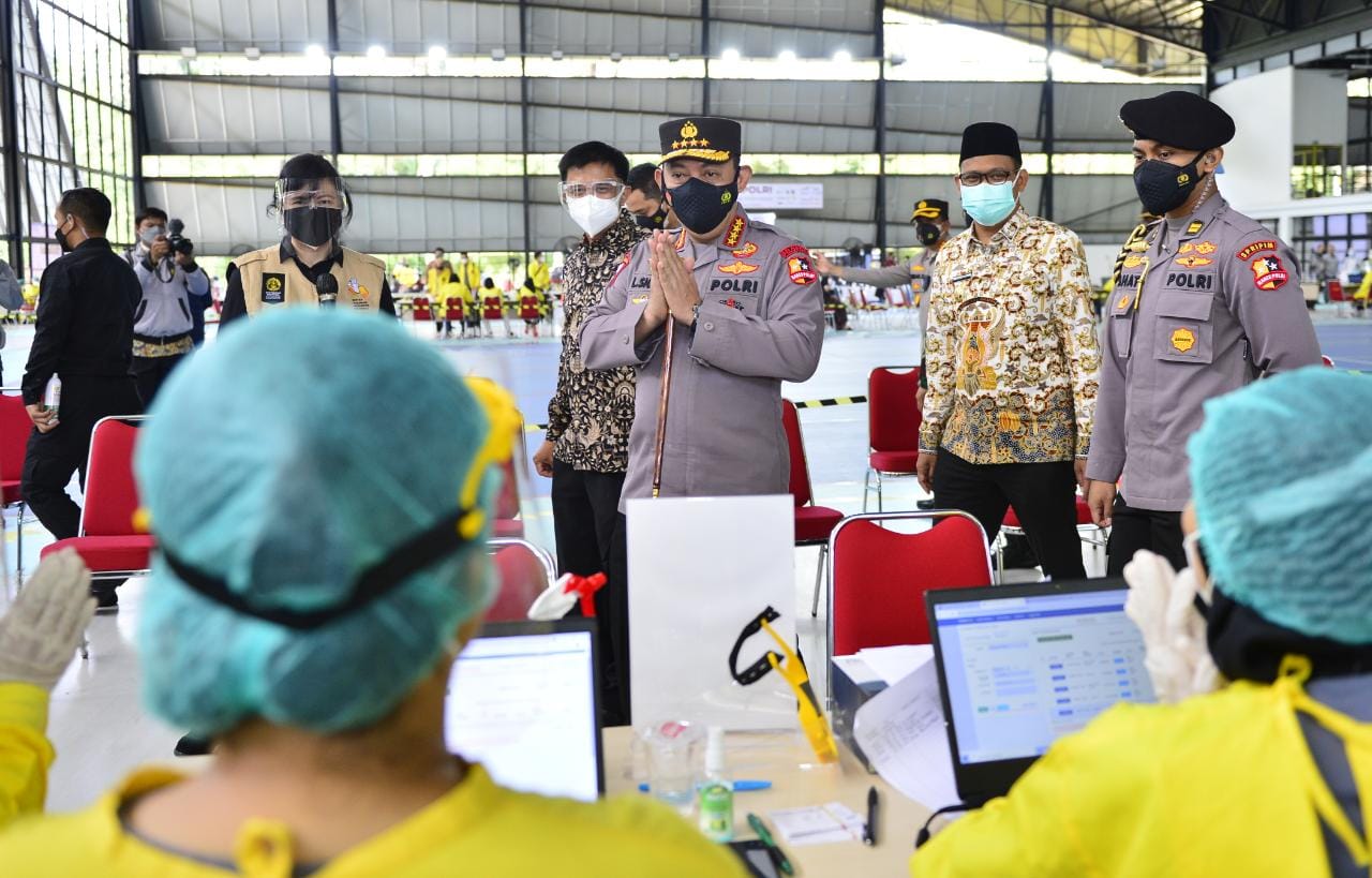 Kapolri Jenderal Listyo Sigit Prabowo meninjau langsung Sentra Vaksinasi Mahasiswa Indonesia (SVMI) di Sarana Olahraga (SOR) Universitas Indonesia (UI), Depok, Jawa Barat, Kamis (12/8/2021).