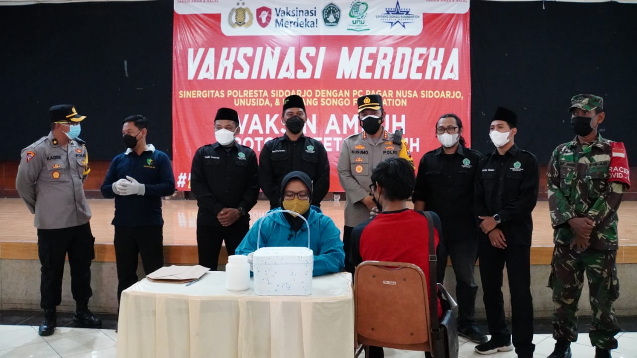Kejar target vaksinasi Kabupaten Sidoarjo capai 70 persen pada awal Oktober 2021 nanti, Polresta Sidoarjo menggandeng Pagar Nusa Sidoarjo menggelar akselerasi vaksinasi Covid-19, dengan target dua ribu orang, pada Kamis (23/9) di Bluru Kidul, Sidoarjo.