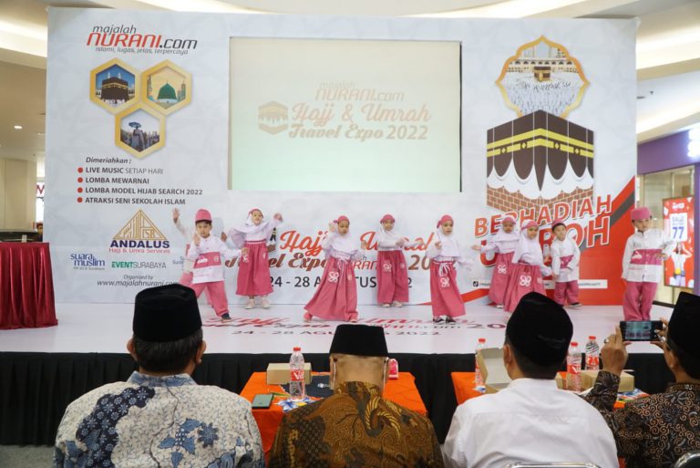 Pentas seni siswa TK Nurul Falah Surabaya menjadi pembuka Hajj & Umra Travel Expo pada Rabu (24/8) di Plaza Surabaya.