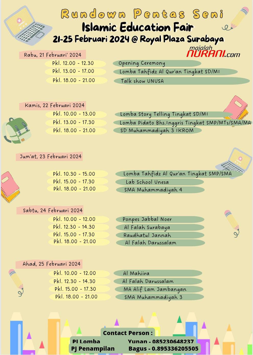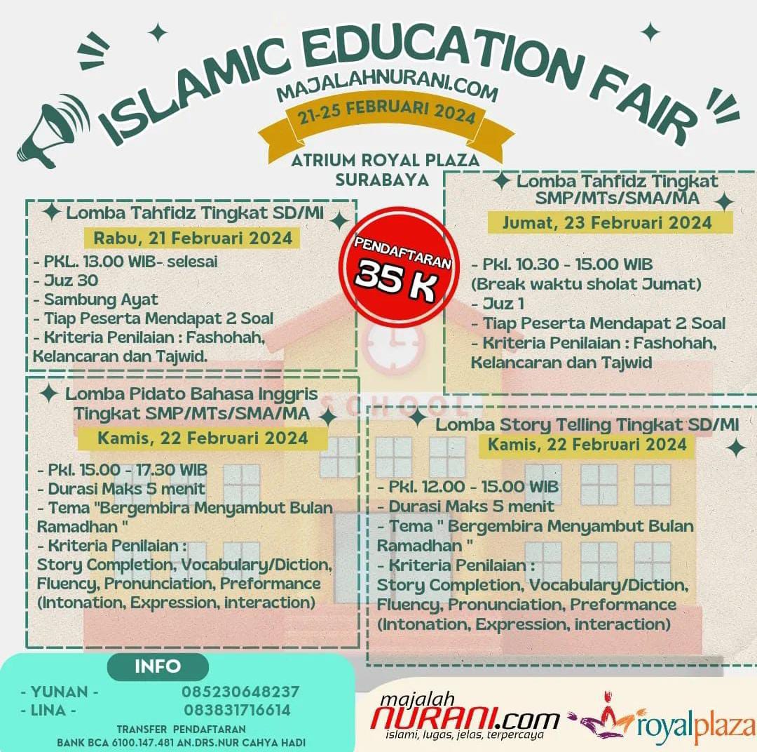 Pameran Sekolah Islam, Islamic Education Fair (IEF) 2024 digelar mulai Rabu 21 Februari hingga Ahad 25 Februari di Atrium Utama Royal Plaza Surabaya. Tahun ini IEF diikuti 12 yayasan, lembaga pendidikan, universitas serta pondok pesantren di Jawa Timur.