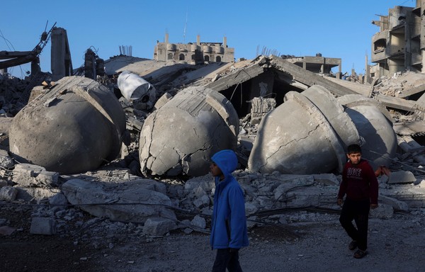 Warga Gaza, Palestina, menggelar salat Tarawih pertama Ramadan tahun ini di sekitar reruntuhan masjid Farouk, Rafah, Gaza Selatan. Masjid tersebut hancur akibat serangan Israel.