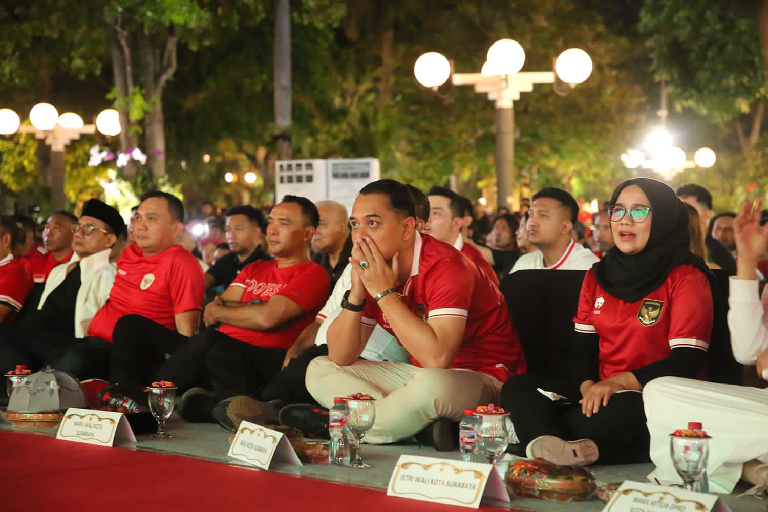 Sebanyak 17.683 warga pendukung Tim Nasional (Timnas) Indonesia, memadati Halaman Balai Kota Surabaya, Senin (29/4) malam. Para suporter skuad Garuda Muda sangat antusias nobar (nonton bareng), menyaksikan Timnas Indonesia U-23, kontra Uzbekistan U-23, dalam pertandingan semifinal AFC Asian Cup (Piala Asia U-23), bersama Wali Kota Surabaya Eri Cahyadi.