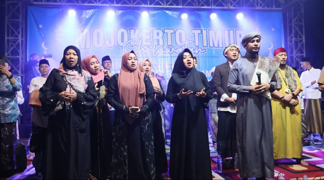 Ribuan masyarakat Kabupaten Mojokerto mengikuti kegiatan Mojokerto Timur bersholawat di lapangan Randuharjo, Kecamatan Pungging, Kabupaten Mojokerto, Sabtu (13/7/2024) malam.
