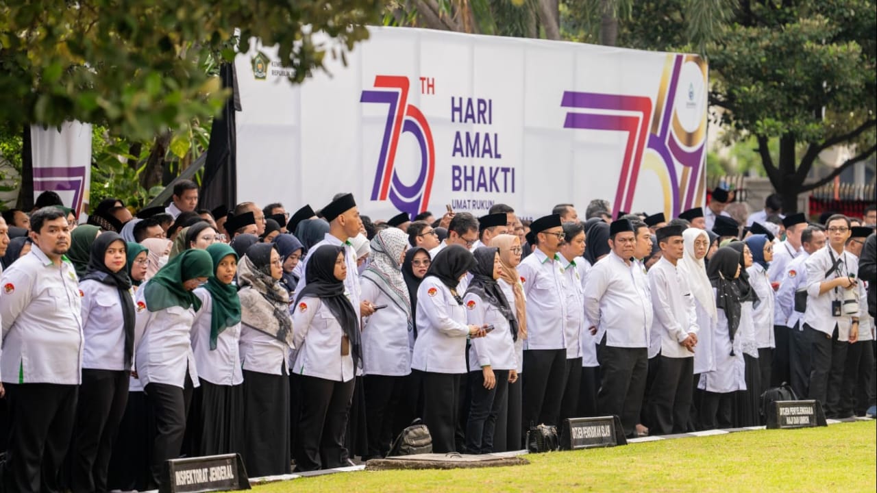 Kementerian Agama (Kemenag) menggelar upacara bendera dalam rangka peringatan Hari Amal Bhakti (HAB) Ke-79, Jumat (3/1/2025).