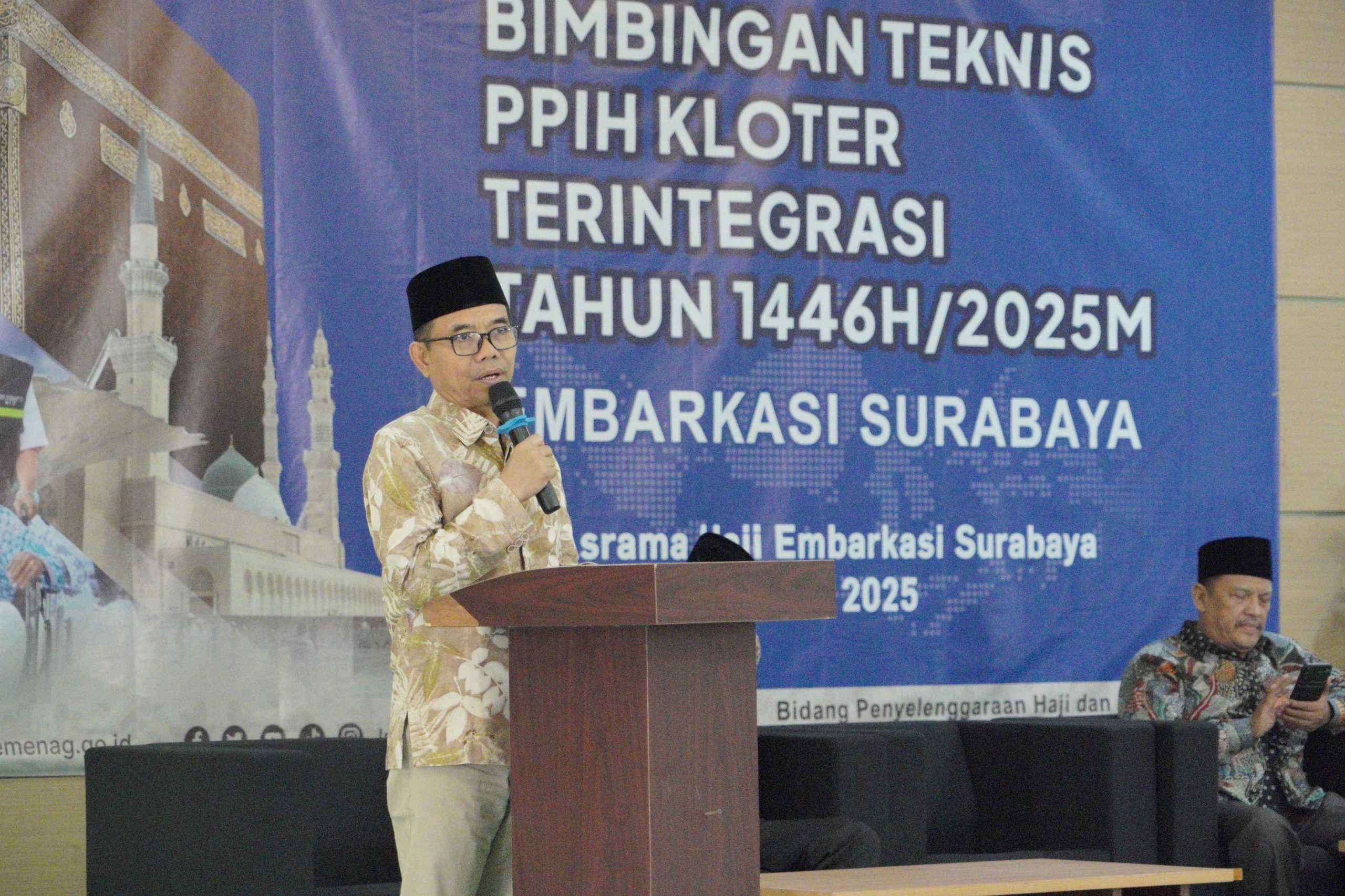 Kegiatan Bimbingan Teknis (Bimtek) Petugas Penyelenggara Ibadah Haji (PPIH) Kloter Terintegrasi Tahun 1446 H / 2025 M Embarkasi Surabaya resmi dibuka pada Sabtu (15/3), di Asrama Haji Sukolilo Surabaya.
