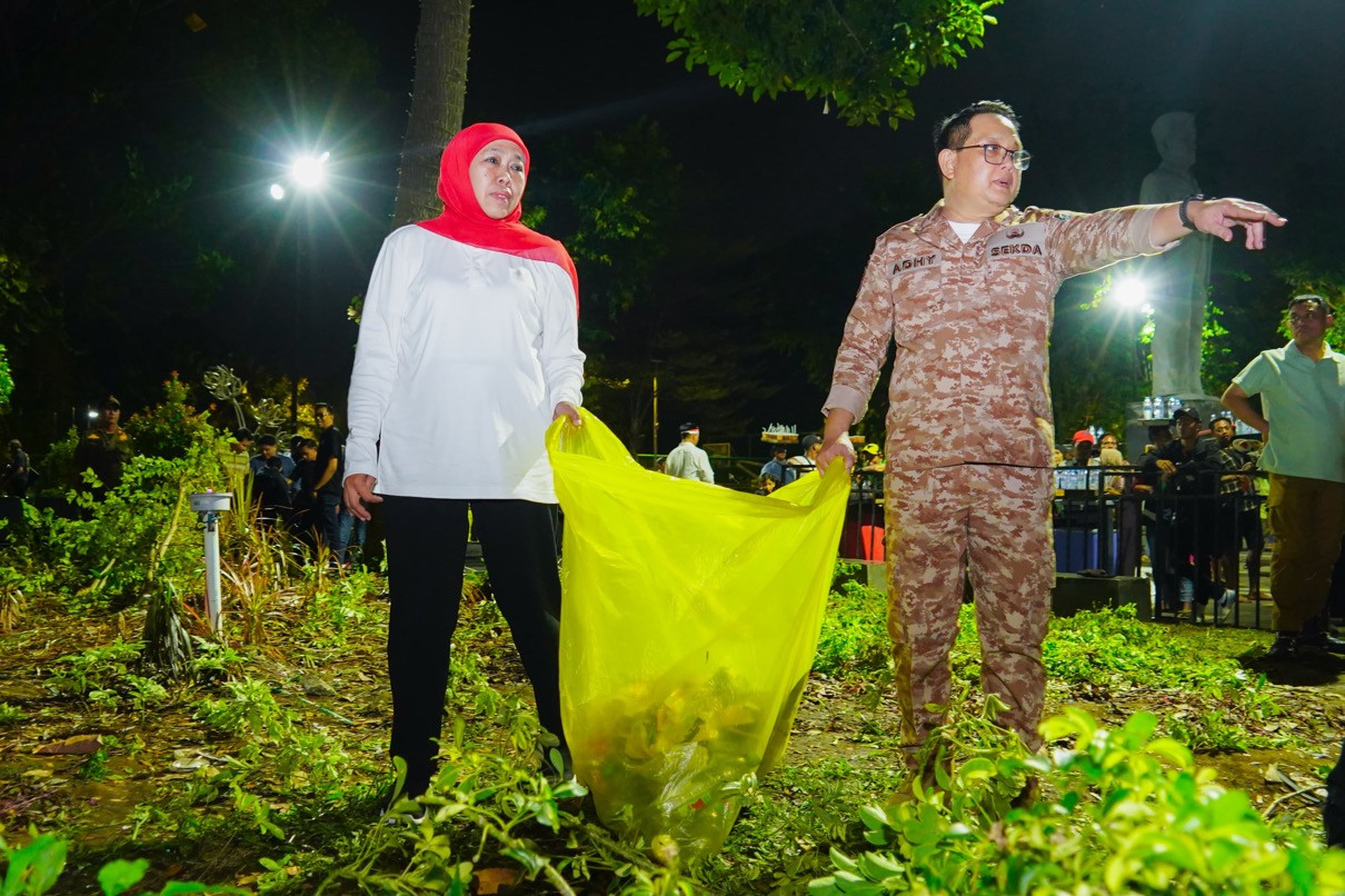 Usai Pesta Rakyat digelar, Khofifah bersama jajaran kepala perangkat daerah turun langsung membersihkan area Taman Apsari.