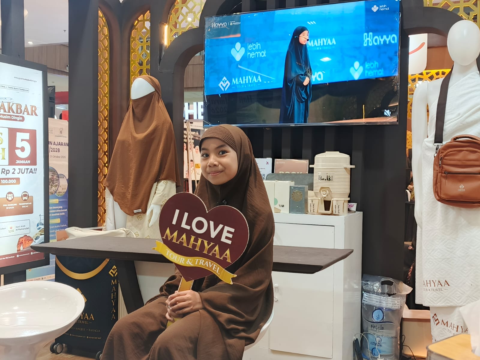 Kehadiran Aisyah di booth Mahya Travel di Pameran Haji dan umrah Majalah Nurani di Matos Malang, Jumat (24/4/2026) menyita perhatian pengunjung pameran.